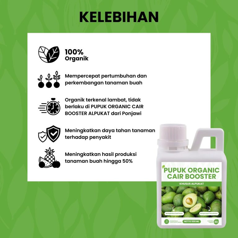 Pupuk Organic Cair Booster Alpukat spesialis tanaman yang dapat membuat hasil Alpukat lebih banyak dan besar, formula dari bahan organik yang aman dan ramah lingkungan, membuat tanaman lebih tahan terhadap serangan penyakit, serta dapat meningkatkan hasil panen.