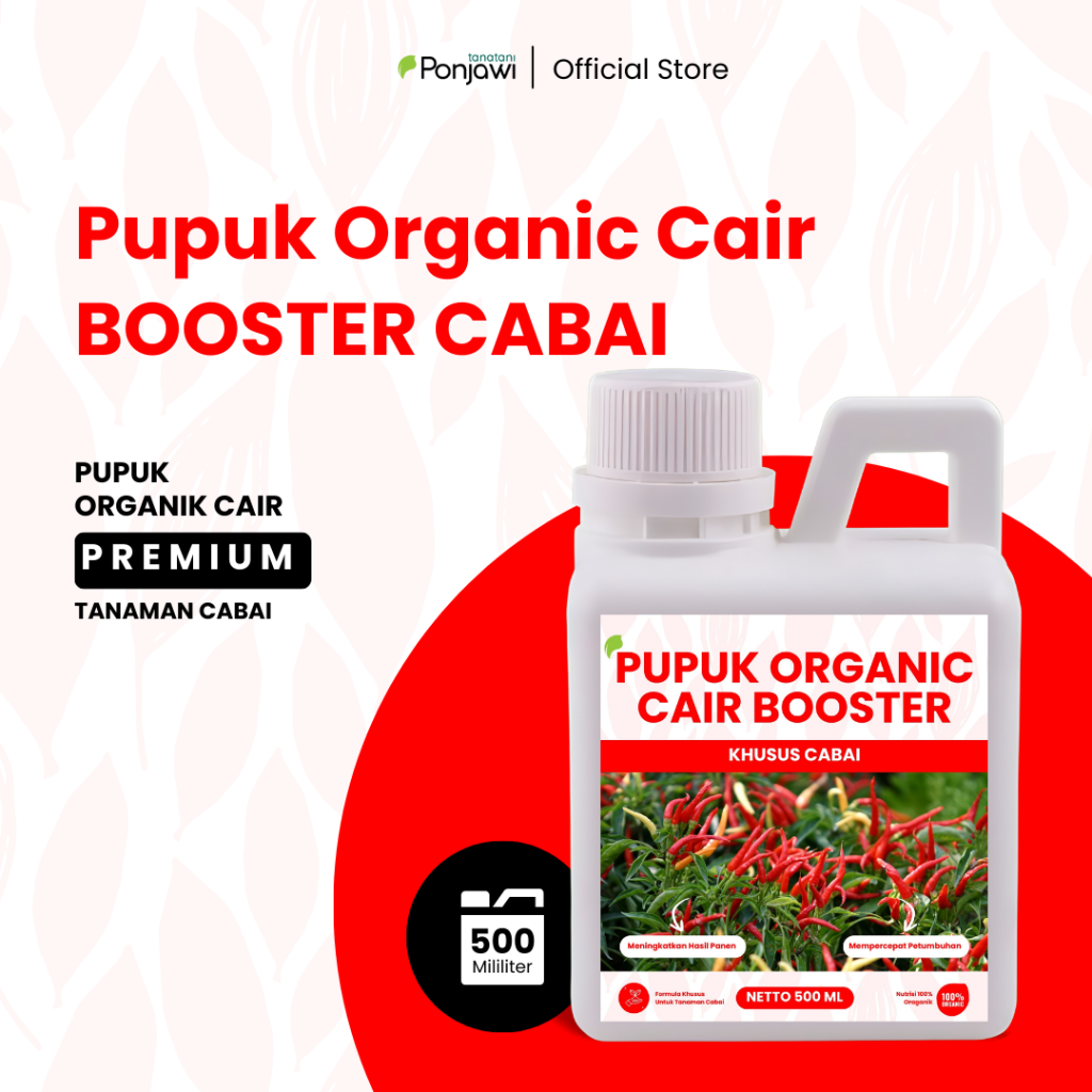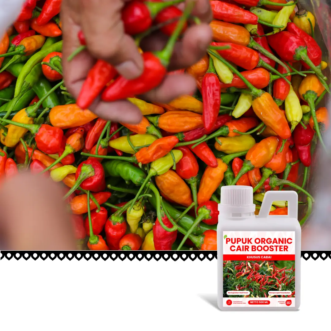 Pupuk Organic Cair Booster Cabai spesialis tanaman buah cabai yang dapat membuat hasil cabai lebat, formula dari bahan organik yang aman dan ramah lingkungan, membuat tanaman lebih tahan terhadap serangan penyakit, serta dapat meningkatkan hasil panen.