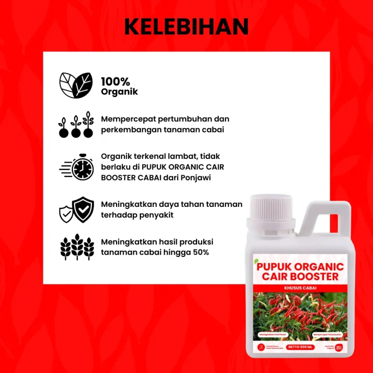 Pupuk Organic Cair Booster Cabai ini membuat rasa buah lebih pedas, panen cabai lebih lebat/rimbun, lebih besar dan seragam. Serta membuat tanaman lebih tahan terhadap layu fusarium & layu bakteri karena adanya Zat Pengatur Tumbuh (ZPT) sekaligus dapat meningkatkan antibody tanaman.