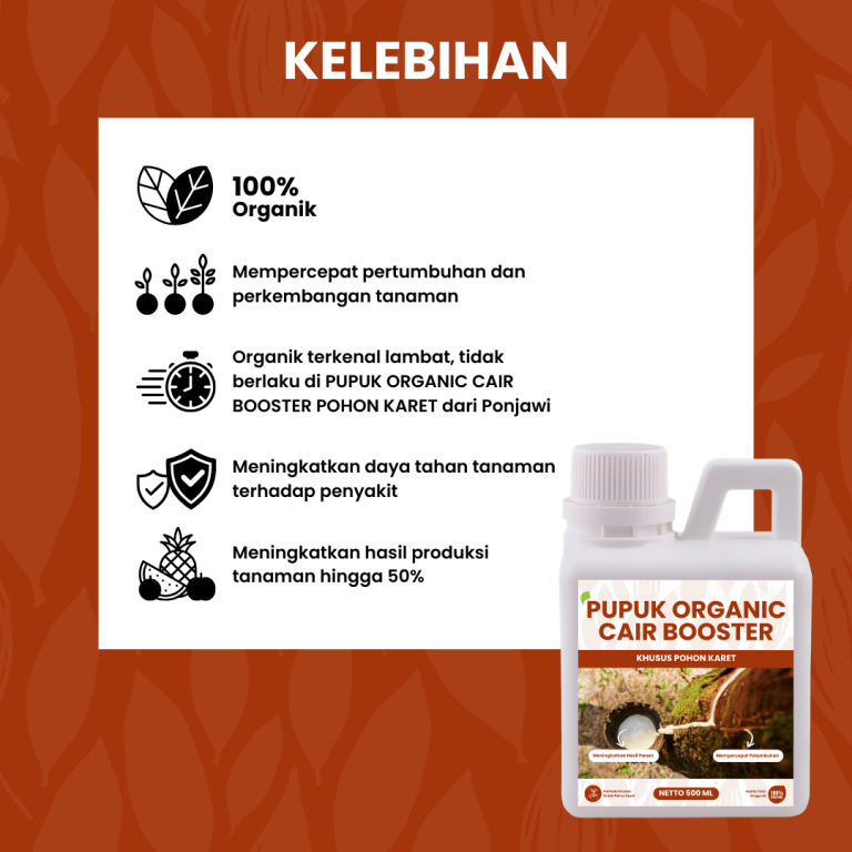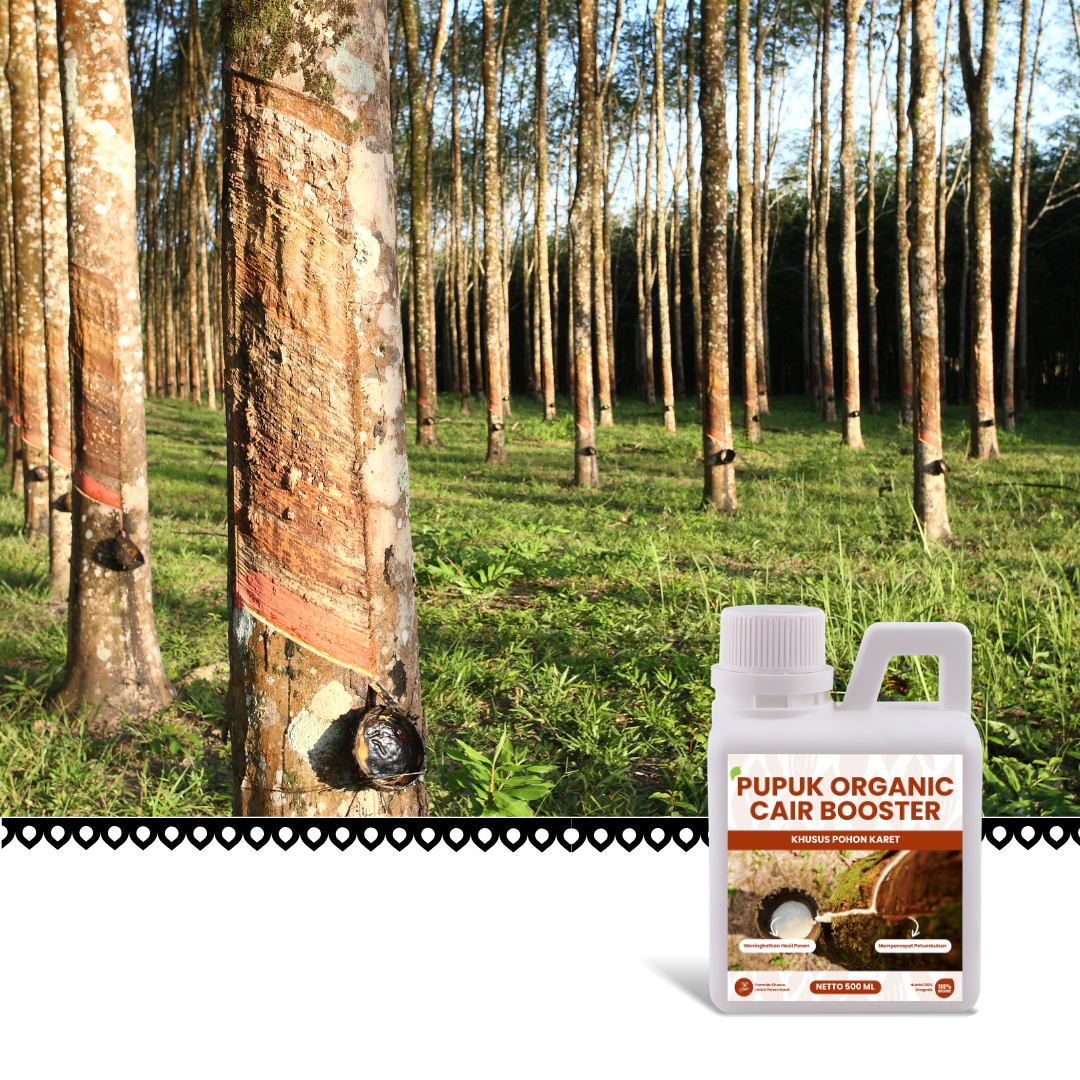 Pupuk Organic Cair Booster Pohon Karet spesialis tanaman karet yang dapat membuat hasil getah karet mengalir deras, formula dari bahan organik yang aman dan ramah lingkungan, membuat tanaman lebih tahan terhadap serangan penyakit, serta dapat meningkatkan hasil panen.