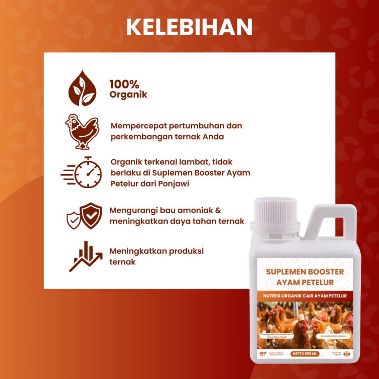 Merupakan suplemen penutrisi dari bahan organik yang diformulasikan untuk meningkatkan produktivitas, mempercepat pertumbuhan, meningkatkan daya tahan dan stamina tubuh, meningkatkan bobot dan menebalkan daging, serta meningkatkan produktivitas untuk hasilkan telur.